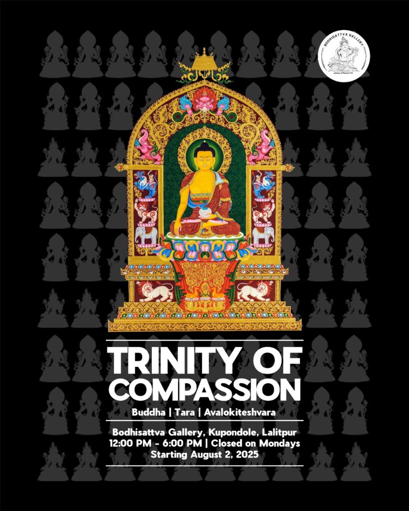 Trinity of Compassion is a profound artistic and spiritual journey that brings together the sacred embodiments of Buddha, Tara, and Avalokiteshvara—timeless icons of enlightenment, compassion, and healing. The exhibition features an exceptional collection of paubhas (traditional Newar paintings) and sculptures created by renowned contemporary and traditional artists. Each piece is a result of meticulous craftsmanship, deep devotion, and generations of inherited knowledge, offering a rare glimpse into the sacred visual language of Himalayan art.